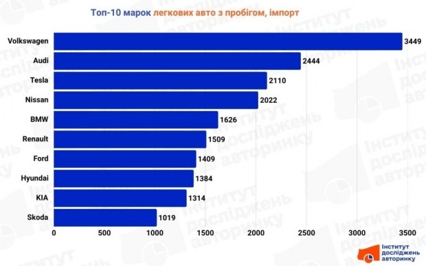 Відомо, що на внутрішньому ринку давно править Volkswagen, однак не лише там - серед новоприбулих з-за кордону він теж на першому місці: 3 449 авто. Далі - Audi (2 444), Tesla (2 110), Nissan (2 022), BMW (1 626). Це вже давно сформоване електро-преміум ядро українського імпорту.