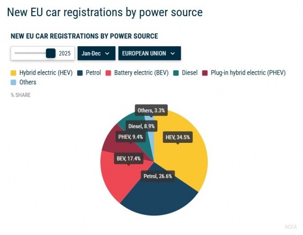 У 2025 році електричні автомобілі становили 17,4% ринку ЄС, що більше, ніж показник у 13,6% роком раніше. Реєстрації гібридних електромобілів захопили 34,5% ринку, залишаючись кращим вибором серед споживачів у ЄС. Тим часом сукупна частка ринку бензинових та дизельних автомобілів впала до 35,5% порівняно з 45,2% у 2024 році.