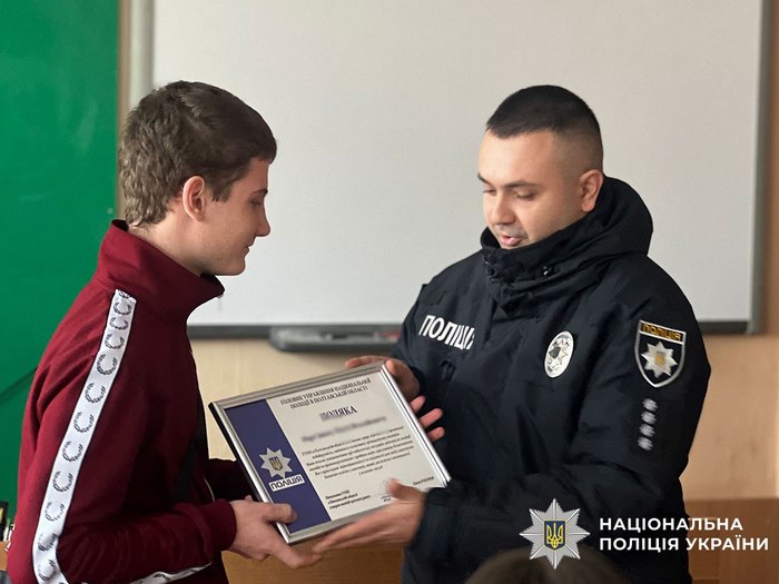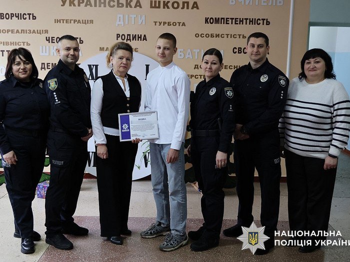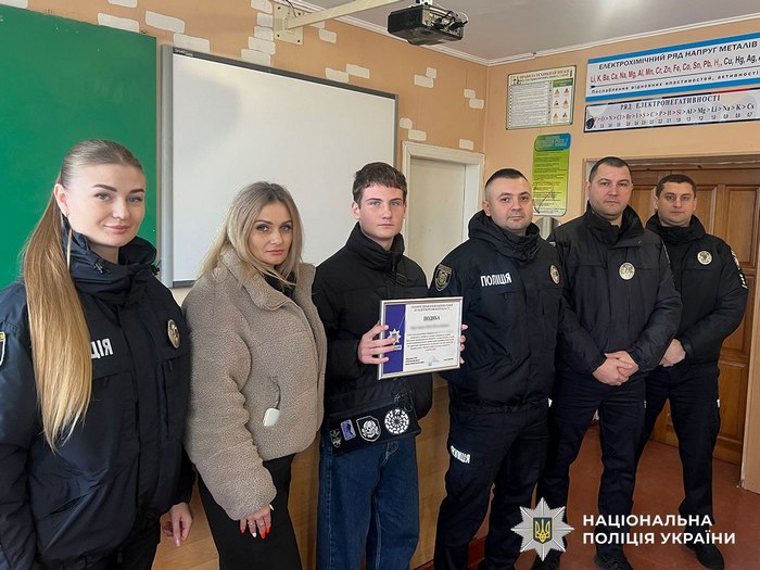 За проявлену небайдужість, сміливість та активну громадянську позицію дев’ятикласник отримав подяку та пам’ятний подарунок з рук начальника відділу організації Служби освітньої безпеки поліції Полтавщини Ігоря Дрібного.
