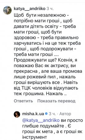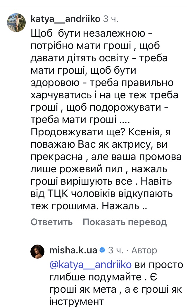 «Ксенія, я поважаю Вас як актрису, ви прекрасна, але ваша промова лише рожевий пил, на жаль, гроші вирішують все», — написали у відповідь.