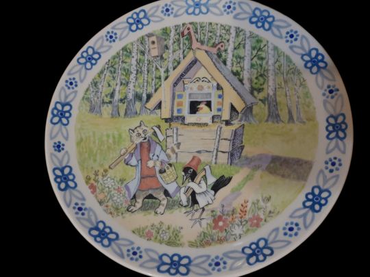 У центрі композиції — знайома сценка: котик пішов по дрова, а півник виліз на піч та й сидить там. Котик несе в кошику, мабуть, пиріжки, а поруч ступає стежкою обережна ворона. Позаду — затишна хатинка з дерев’яними пташками на даху й віконницями. А ще далі — казковий ліс… Край тарілки прикрашає блакитний квітковий орнамент, створюючи атмосферу затишку. Це одна з робіт художниці Валентини Покосовської, присвячених казковій тематиці. Тарілка є яскравим прикладом поєднання функціонального й декоративного мистецтва та свідченням популярності казкових сюжетів в українському фарфорі.