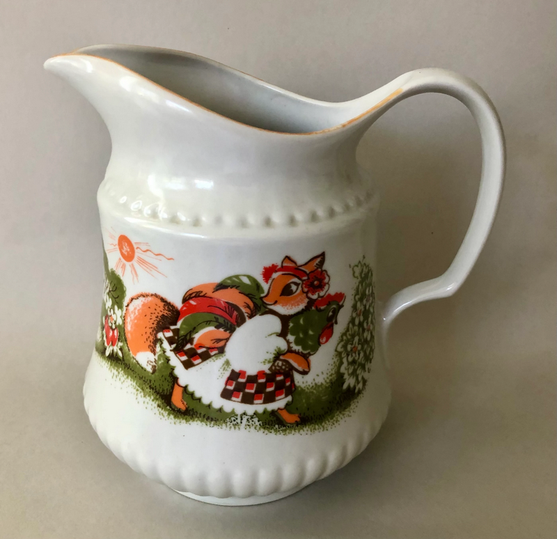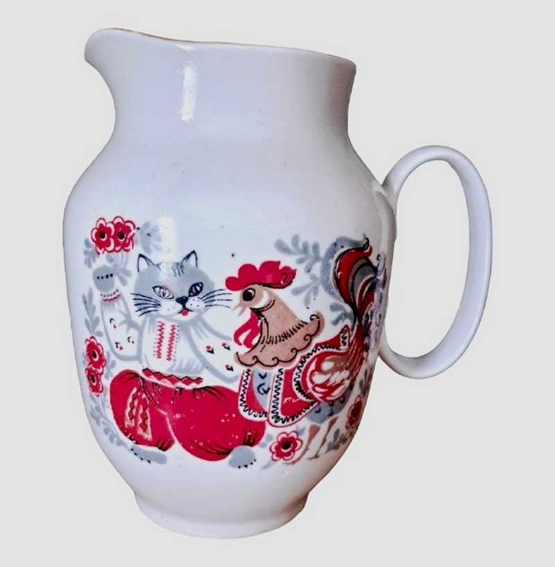 На білому фоні глечика розгортається динамічна сцена з української народної казки. Підступна лисиця несе півника, якого приманила лестощами. Розгублений півник кличе свого вірного друга котика. Сонце вгорі — знак життя й надії, воно ще не зайшло, а значить, порятунок можливий.