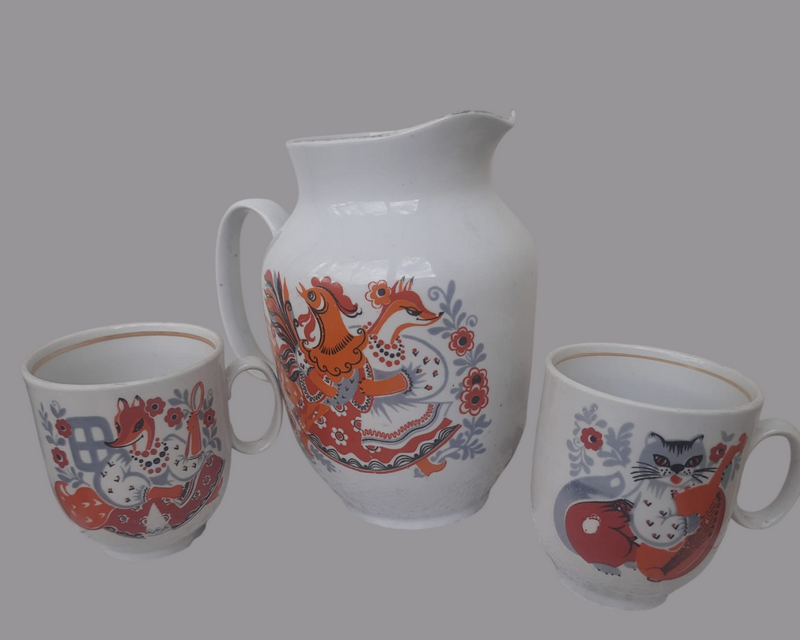 — Микола Козак та Зінаїда Олексенко створили набір, що складається з глечика та шести чашок, оздоблених яскравими сюжетними сценами за мотивами цієї казки, — продовжує Людмила Карпінська-Романюк. - Кожен предмет розповідає окремий епізод історії: як котик та півник жили у злагоді, як хитра лисиця виманює півника, як вірний котик рятує свого друга. Малюнки, виконані в теплій гамі помаранчево-червоних і сірих тонів, створюють атмосферу доброзичливості, щирості й домашнього затишку. Завдяки декоративному розпису, що охоплює різні боки кожного предмета, казка ніби розгортається у просторі. Дитина, тримаючи чашку, може стежити за розвитком сюжету, подорожуючи сторінками чарівної історії. Цей набір перетворює звичайне чаювання на маленьку подорож у світ української народної мудрості.
