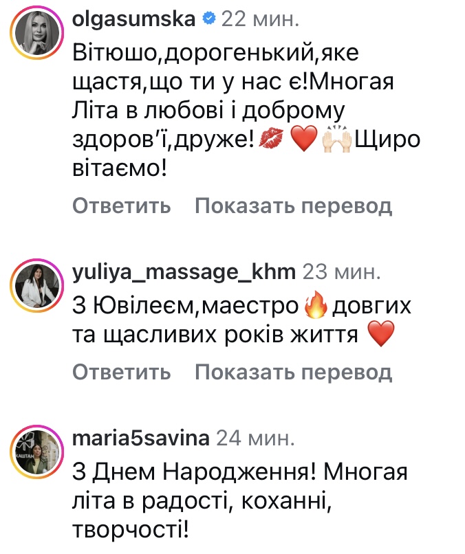 «Вітюшо, дорогенький, яке щастя, що ти у нас є! - привітала акторка Ольга Сумська. — Многая літа в любові і доброму здоровʼї, друже! Щиро вітаємо!»