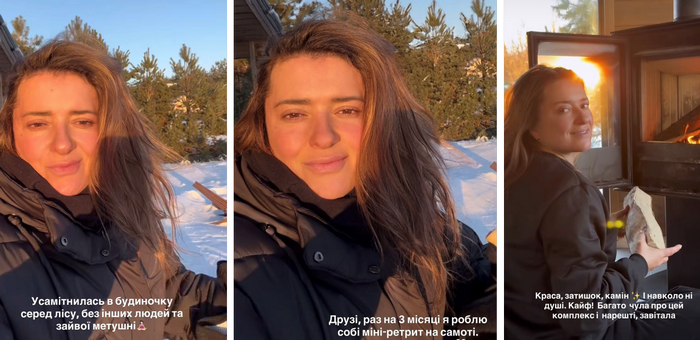 «Усамітнилася в будиночку серед лісу, — поділилася Могилевська. — Краса, затишок, камін. І навколо ні душі. Кайф!»
