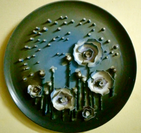 — А ця таріль мов тиха музика сутінків. Темна глибина тла нагадує землю, напоєну дощем, поле після грози, коли повітря ще вологе, а квіти тільки-но відкривають очі до нового дня. Квіти піднімаються із цього мороку повільно, мов із глибини пам’яті. Їхні стебла тонкі, витягнуті. У цих формах є щось людське: прагнення, зусилля, віра. Кожна квітка — окрема історія. Одні розкрилися повністю, інші лише готуються до народження. Це ритм життя, який художник зумів передати не кольором, а пластикою.
