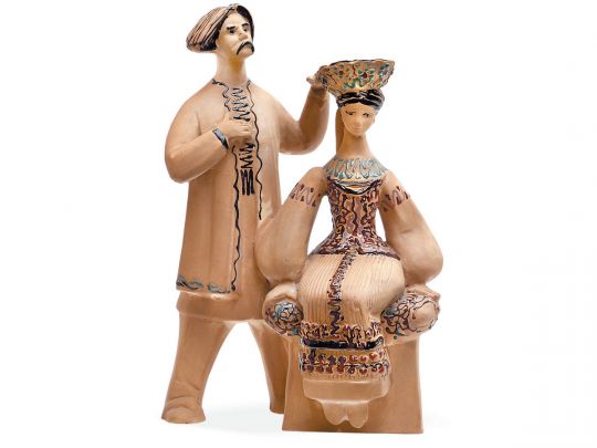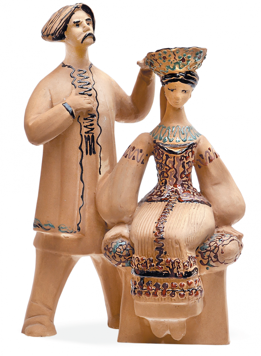 — Кольори стримані, теплі, земляні — ніби сама глина говорить про зв’язок людини з землею. Матеріал — кам’яна маса — додає композиції особливої ваги. Вона ніби створена не лише для споглядання, а для збереження часу. У цій роботі звучить тиха гуцульська музика: повільна, глибока, трохи сумна, але світла. Здається, що ще мить — і пролунає благословення, і заспіває весільна родина, а ця закам’яніла в часі сцена знову стане рухом та життям. Поряд із коростенським фарфором поступово здобувала визнання і коростенська художня кераміка — роботи в кам’яній масі, що розширили творчі можливості митців і дали змогу працювати у більш монументальній, пластично виразній манері. Кам’яна маса — це керамічний матеріал, який за властивостями знаходиться між фаянсом і фарфором.