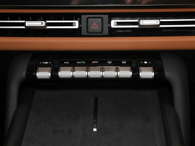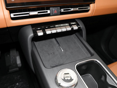 В салоне — большой экран медиасистемы, под которым расположены воздуховоды и ряд физических кнопок — редкость для современных китайских моделей. На центральном тоннеле размещены площадка беспроводной зарядки, селектор режимов движения и подстаканники. Как и у других моделей бренда, отдельной приборной панели, вероятно, не будет — вся информация выводится на центральный экран.