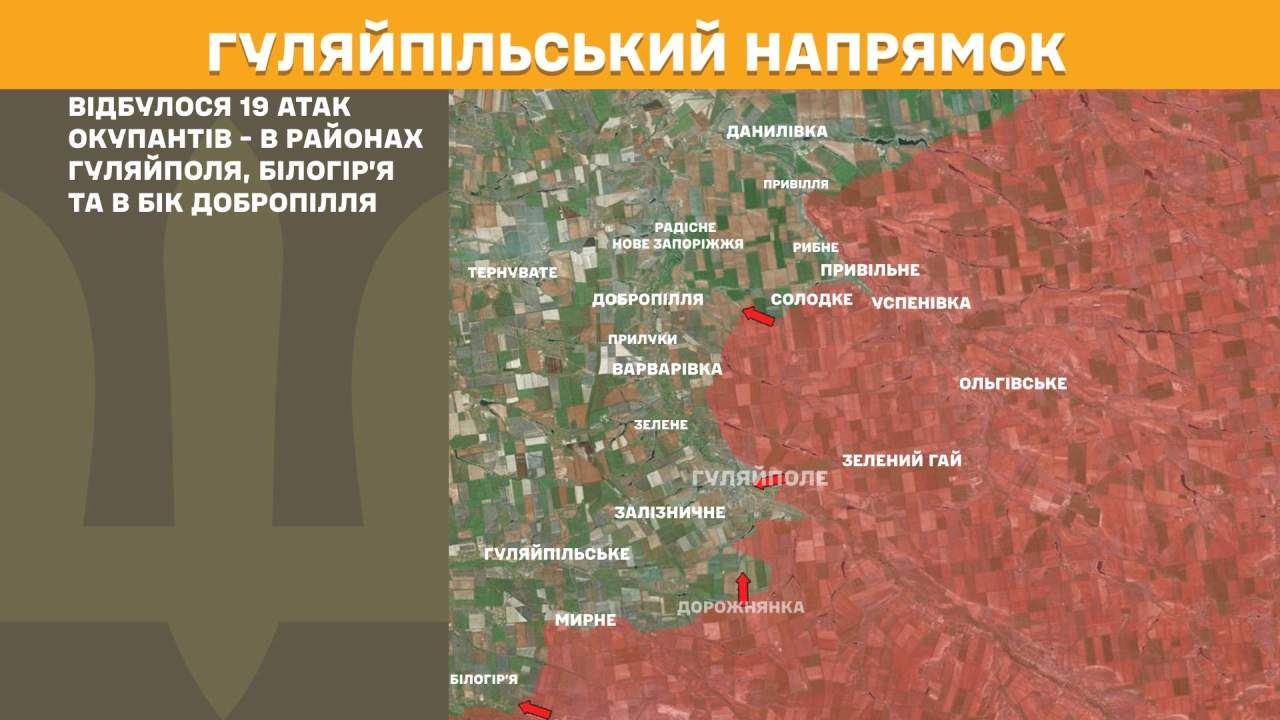 На Гуляйпільському напрямку відбулося 19 атак окупантів - в районах Гуляйполя, Білогір’я та в бік Добропілля.