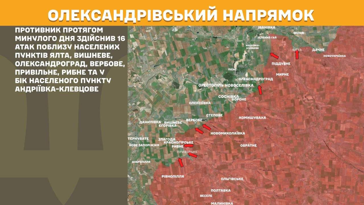 На Олександрівському напрямку противник протягом минулого дня здійснив 16 атак поблизу населених пунктів Ялта, Вишневе, Олександроград, Вербове, Привільне, Рибне та у бік населеного пункту Андріївка-Клевцове.