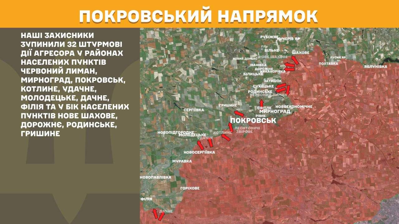 На Покровському напрямку наші захисники зупинили 32 штурмові дії агресора у районах населених пунктів Червоний Лиман, Мирноград, Покровськ, Котлине, Удачне, Молодецьке, Дачне, Філія та у бік населених пунктів Нове Шахове, Дорожнє, Родинське, Гришине.