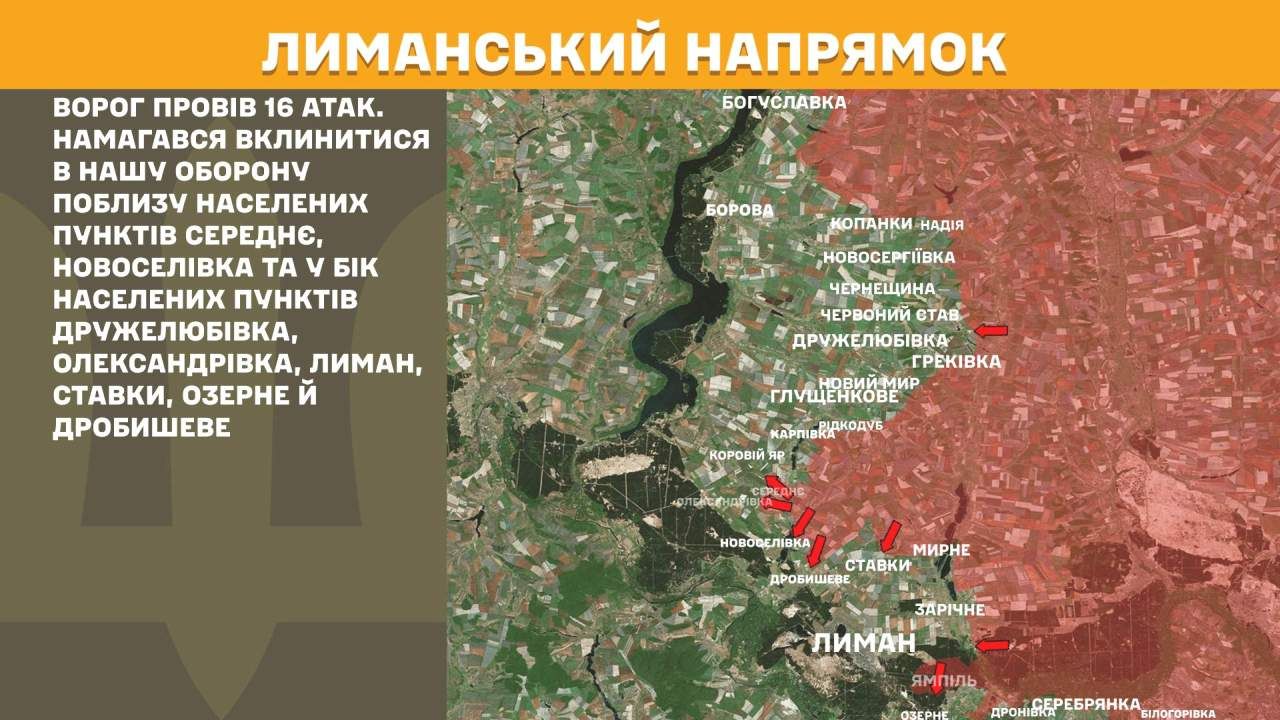 На Лиманському напрямку ворог провів 16 атак. Намагався вклинитися в нашу оборону поблизу населених пунктів Середнє, Новоселівка та у бік населених пунктів Дружелюбівка, Олександрівка, Лиман, Ставки, Озерне й Дробишеве.