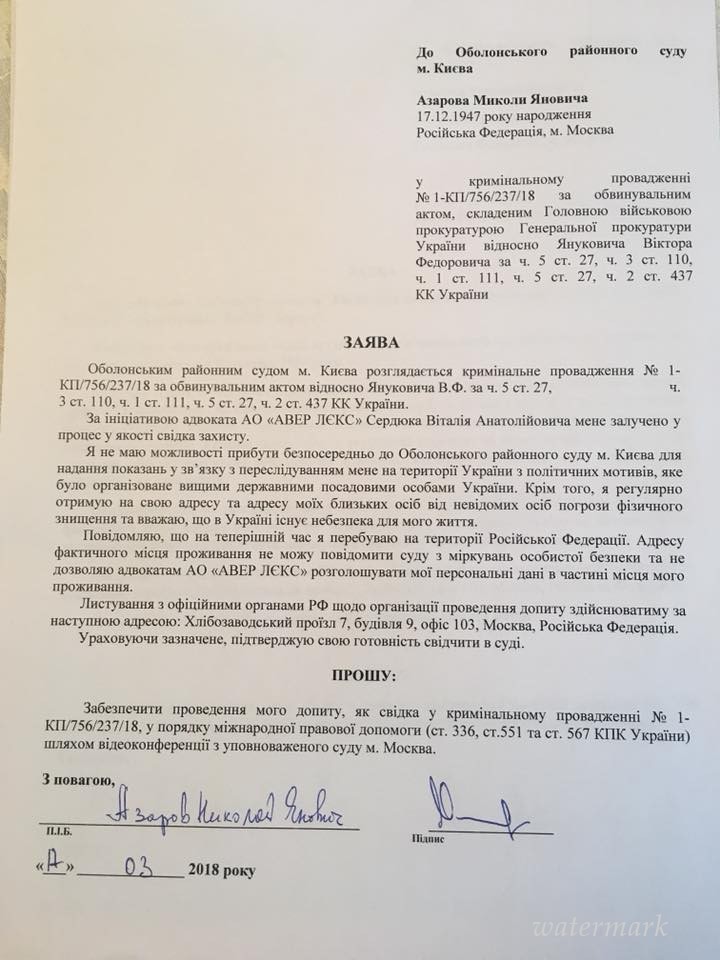 В заявлении Азарова сказано, что он готов дать показания в суде в качестве свидетеля защиты по инициативе Сердюка.