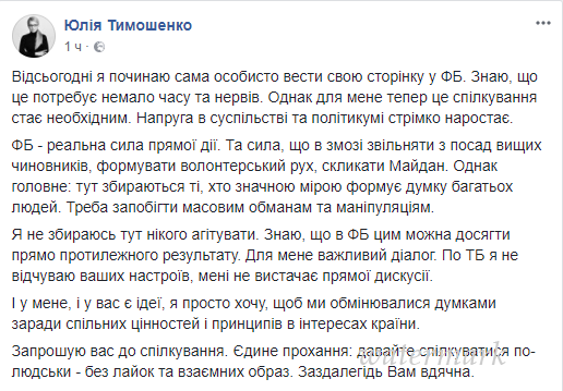 «С сегодняшнего дня я начинаю сама лично вести свою страницу в ФБ. Знаю, что это требует немало времени и нервов. Однако для меня теперь это общение становится необходимым. Напряжение в обществе и политикуме стремительно нарастает. ФБ — реальная сила прямого действия. И сила, которая в состоянии увольнять с должностей высших чиновников, формировать волонтерское движение, созывать Майдан», — написала она.