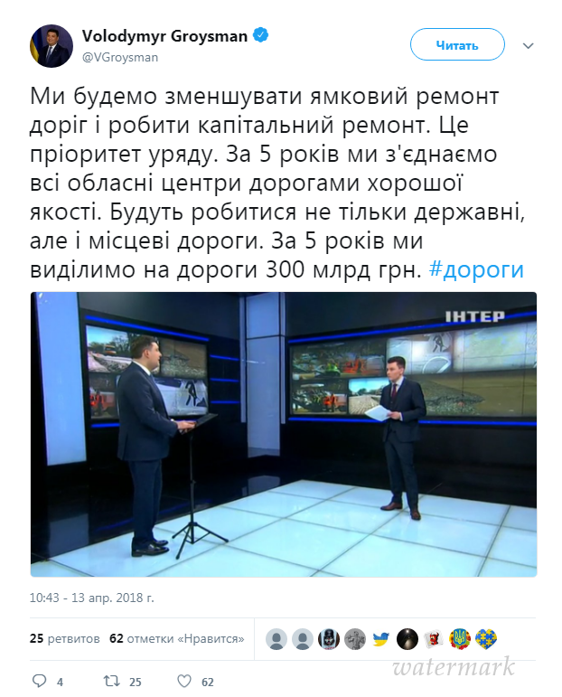 «Мы будем уменьшать ямочный ремонт дорог и делать капитальный ремонт. Это — приоритет правительства», — написал Гройсман, пообщеав при этом, что за 5 лет все областные центры будут соединены дорогами хорошего качества.