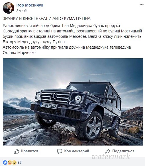 «Утро оказалось действительно добрым. И на Медведчука бывает проруха... Сегодня утром в столице на автомойке, расположенной на улице Мостицкой, бухой работник похитил автомобиль Mercedes-Benz G-класса, который принадлежит Виктору Медведчуку — куму Путина», — отметил он.