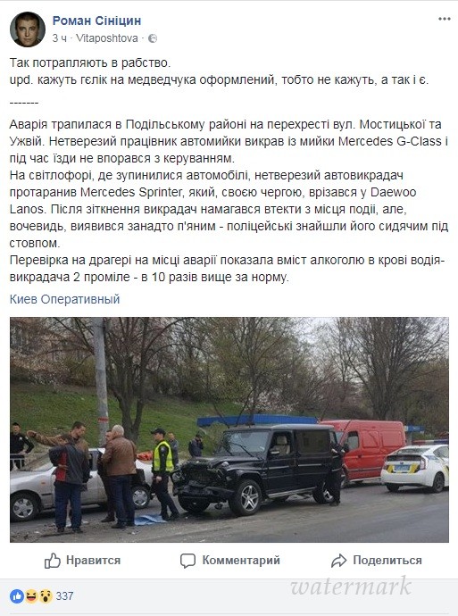 Волонтер Роман Синицын на своей странице в Facebook также сообщил, что в Подольском районе столицы пьяный работник автомойки угнал автомобиль Mercedes G-Class, не справился с управлением и попал в ДТП.