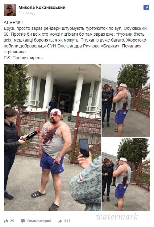 «Просто сейчас рейдеры штурмуют общежитие по улице Обуховской, 60. Там сейчас титуханы бьют всех, жители защищаются, как могут. Титуханов очень много. Жестоко избили добровольца ОУН Александра Рычкова „Будяка“. Началась стрельба», — написал Коханиивский.