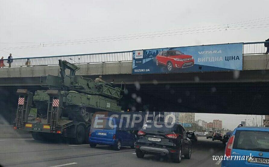 Сегодня, 17 апреля, в Киеве произошло резонансное ДТП. Как выяснили журналисты «Фразы», водитель тягача, на котором перевозилась военная техника, не смог объективно оценить высоту автомобиля, в результате чего, тягач застрял под мостом.