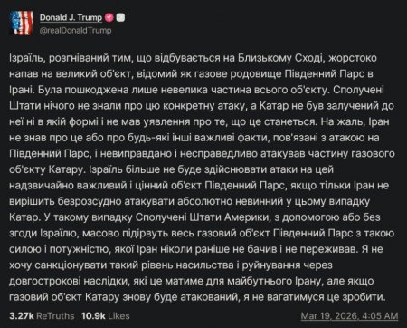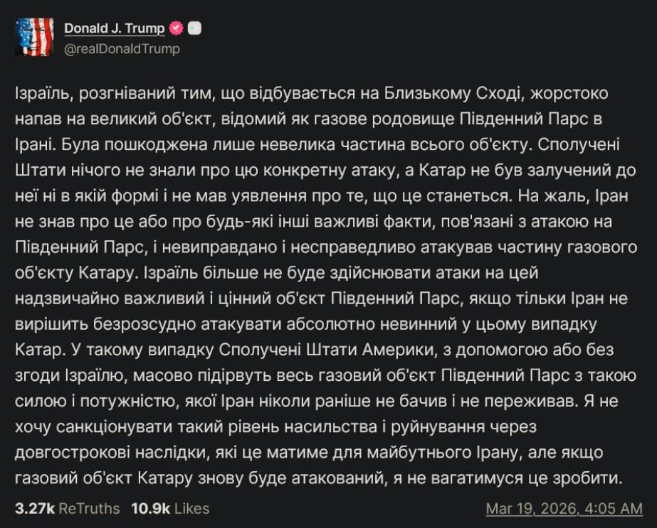 В соціальній мережі Truth Social він зазначив, що США не знали про планування Ізраїлем такого удару. Та додав, що якщо іранці не атакуватимуть Катар, їхнє газове родовище Південний Парс також не буде атаковано.