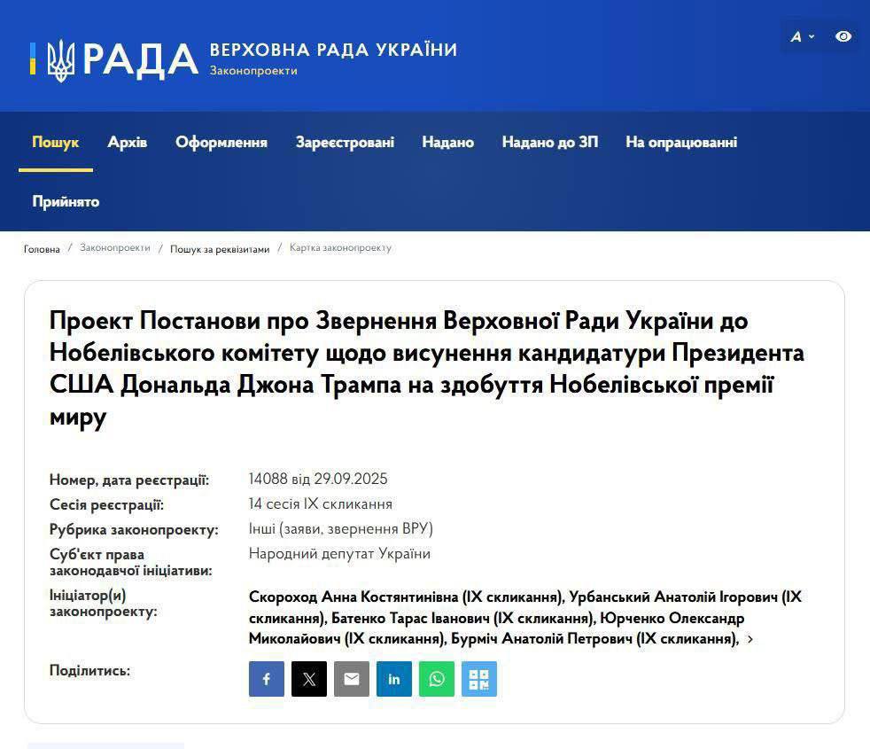 До Верховної Ради України, яка нещодавно схвалила жорстке покарання за СЗЧ, внесено проєкт постанови про звернення до Нобелівського комітету щодо висунення кандидатури президента США Дональда Джона Трампа на здобуття Нобелівської премії миру.