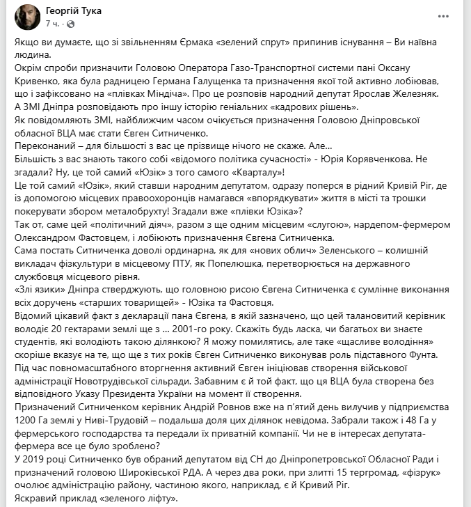 У 2019 році Ситниченко був обраний депутатом від СН до Дніпропетровської обласної ради й призначений головою Широківської РДА. А через два роки, при злитті 15 тергромад, «фізрук» очолює адміністрацію району, частиною якого, наприклад, є й Кривий Ріг. Яскравий приклад «зеленого ліфту», — підкреслив Тука.