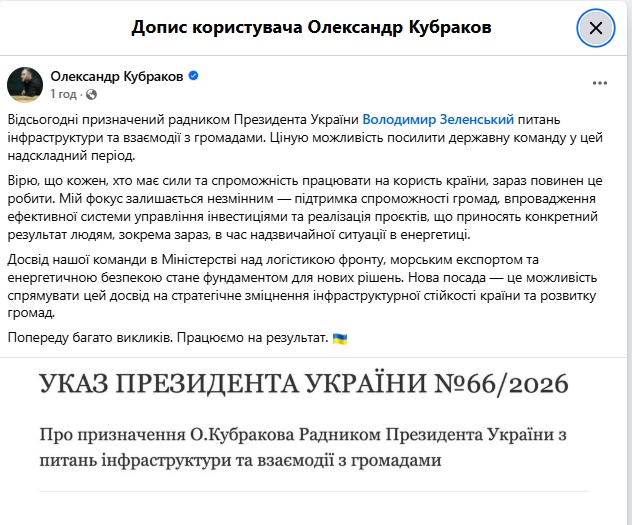 Відомо, що Олександр Кубраков отримав цю посаду поза штатом, тобто працюватиме без формальної штатної посади в Адміністрації президента. У новій ролі він відповідатиме за координацію проєктів розвитку інфраструктури та покращення взаємодії між владою та місцевими громадами.