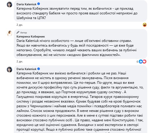 «Якщо ви навчитеся вибачатися у будь-якій послідовності — це вже буде неплохо. Спробуйте, чимало людей чекають ваших вибачень за публічні обвинувачення, які не містили жодних фактичних відомостей, — підсумувала Коберник.