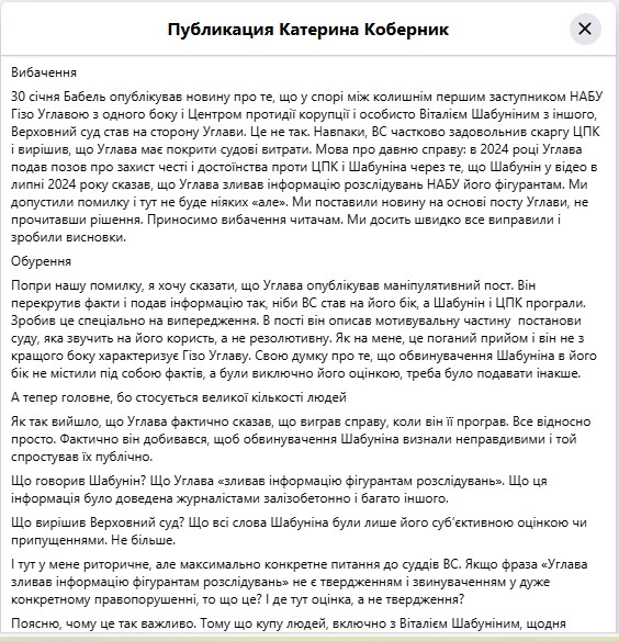 Голова Центру протидії корупції Віталій Шабунін бездоказово публічно обвинувачує людей, а потім у судах доводить, що його слова — лише припущення без фактів. Про це написала головна редакторка видання «Бабель» Катерина Коберник, відповідаючи на вимогу виконавчої директорки ЦПК Дар'ї Каленюк вибачитися перед організацією та Шабуніним.