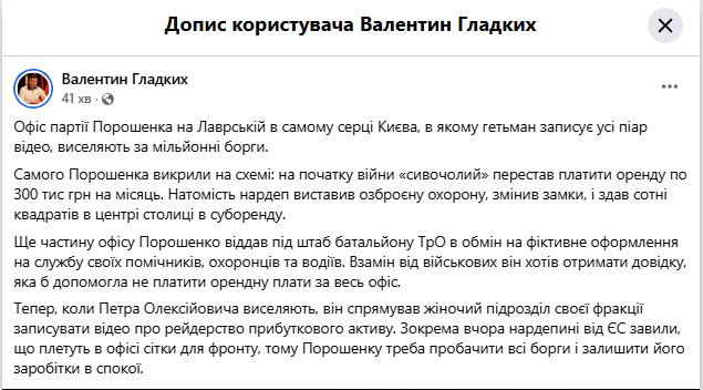 «Самого Порошенка викрили на схемі: на початку війни „сивочолий“ перестав платити оренду по 300 тис грн на місяць. Натомість нардеп виставив озброєну охорону, змінив замки, і здав сотні квадратів в центрі столиці в суборенду», — зазначає Гладких.