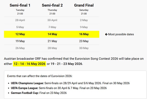 В настоящее время организаторы конкурса опубликовали вероятные даты проведения следующего шоу. Согласно информации сайта Eurovisionworld, полуфиналы и грандфинал традиционно пройдут в мае. Рассматриваются два возможных варианта: