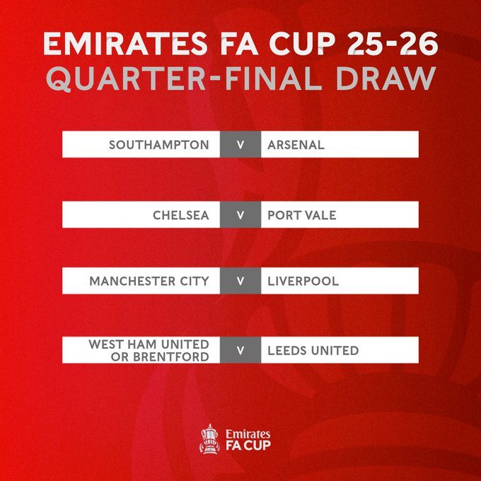 Відбулося жеребкування чвертьфіналу Кубка Англії. Церемонія пройшла на стадіоні Лондон Стедіум перед матчем п’ятого раунду між Вест Гемом та Брентфордом.